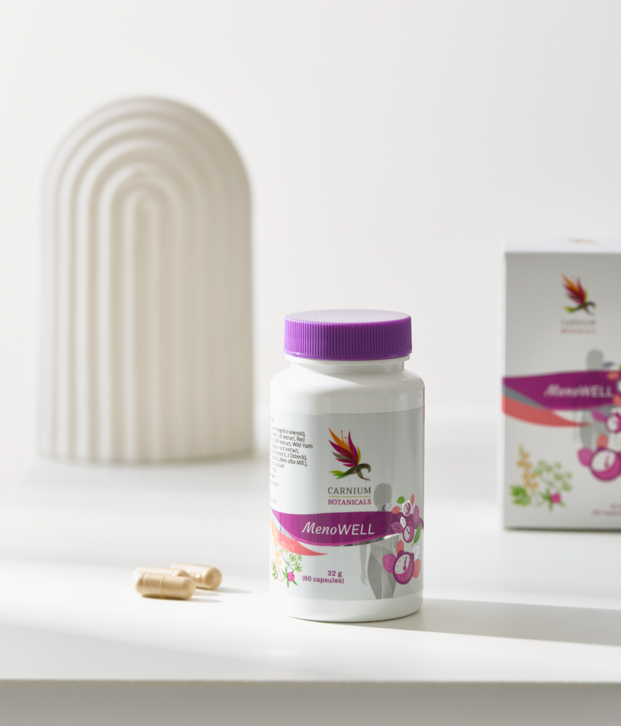 MenoWELL je naravno prehransko dopolnilo, posebej zasnovano za podporo ženskam v obdobju menopavze in klimakterija (prehodno obdobje, ko telo prehaja iz rodnega obdobja v nerodno). V tem času lahko ženske doživljajo različne hormonske spremembe, ki vplivajo na njihovo počutje. MenoWELL združuje skrbno izbrane naravne izvlečke, ki pomagajo ublažiti simptome menopavze ter podpirajo splošno fizično in mentalno dobro počutje. Navadna konopljevka (Vitex agnus-castus) pomaga pri ohranjanju hormonskega ravnovesja in lajša simptome, kot so vročinski oblivi, nihanje razpoloženja in razdražljivost. Prispeva tudi k okrevanju telesa in uma, kar izboljšuje fizično ter psihično počutje žensk v občutljivem obdobju klimakterija. Korenika grozdnate svetilke (Cimicifuga racemosa) podpira miren in udoben prehod skozi menopavzo. Lajša neprijetne simptome, kot so potenje, nemir in razdražljivost, ter prispeva k splošnemu udobju. Črna detelja (Trifolium pratense), bogata z naravnimi izoflavoni, podpira zdravje srca in ožilja. Krepi elastičnost krvnih žil, izboljšuje delovanje srca in pomaga uravnavati krvni tlak, kar je še posebej pomembno za ženske v menopavzi. Sladki koren (Glycyrrhiza glabra) pomaga ohranjati normalno delovanje prebavnega sistema in prispeva k ravnovesju v prebavnem traktu. Njegove blagodejne lastnosti izboljšujejo prebavno udobje in pomagajo lajšati težave, kot so napihnjenost ali občutljivost prebave. MenoWELL je naravna rešitev za lajšanje neprijetnih simptomov menopavze in klimakterija. Z redno uporabo pomaga ženskam, da se lažje soočajo s hormonskimi spremembami ter uživajo v boljšem počutju in večji energiji.